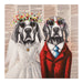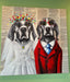 These hounds just took their vows, and they take them very seriously. Charming & unique, these two dogs stand side by side against a retro newspaper background. The groom sports a red suit, while the bride is wearing a beautiful white wedding gown & a fabulous flower crown. This wonderful painting on canvas will look great in any home or office.