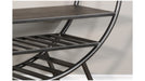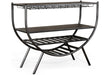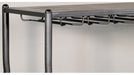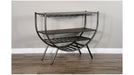A curved metal frame offers unique style to the Homestead Wine Rack Server by Sunny Designs. Its wood top & lower shelf are made from rough-sawn mahogany wood & veneer, and it has metal hangers for stemware storage plus slatted shelves for wine bottles.